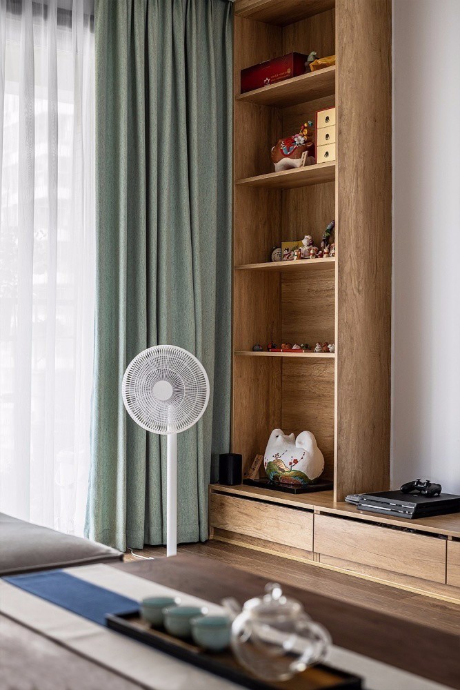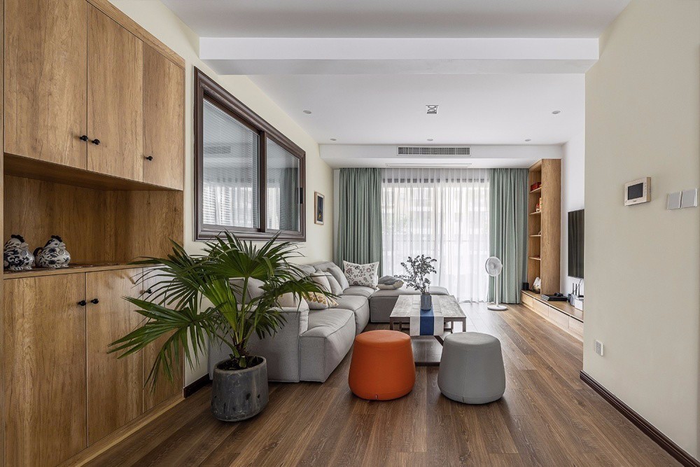 電視墻,簡單整齊的地柜抽屜和一排隔板柜,收納與展示功能并存。