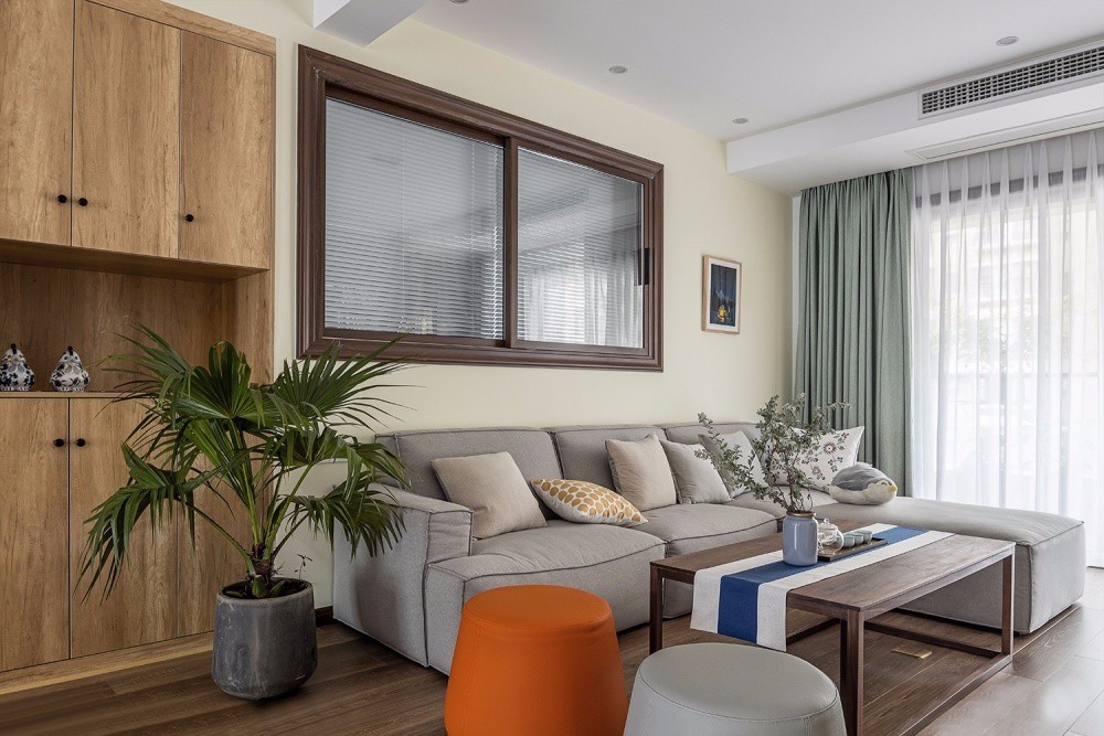 客廳利用半墻加窗戶的形式與書房連接,并在沙發背景墻左側利用書房空間做成了儲物柜,將行李箱安置地妥妥的,中部留空的設計便于小物件的取放。