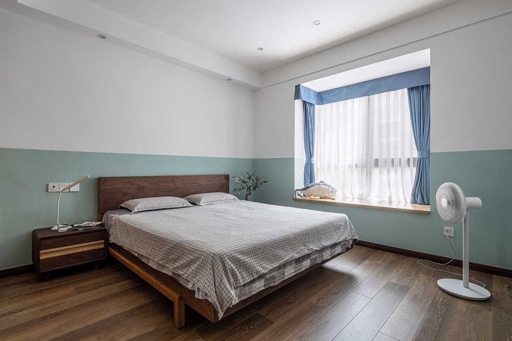 主臥墻面采用白色與淺綠色上下分色的涂刷效果,形成獨特的圍和感。簡潔舒適的灰調床品,營造寧靜安逸的睡眠氛圍。加入綠植的點綴,帶來清新自然的味道。