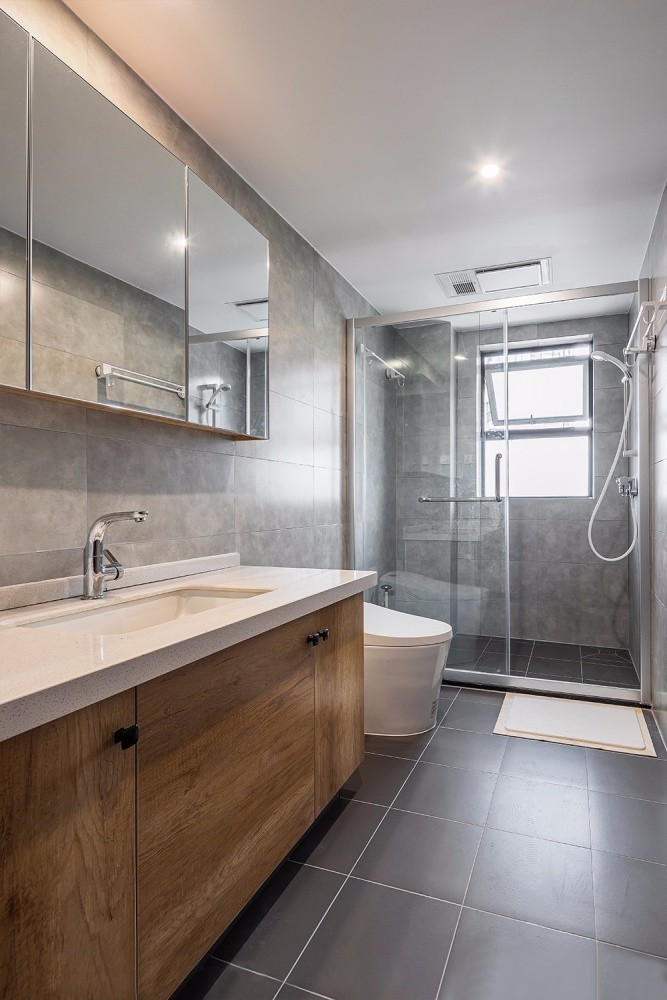 打通次衛干濕分區的一堵墻,采用玻璃隔斷的設計,既不怎么占用空間,視覺上也變得很寬敞。超大的浴室柜真的很實用,大面積的鏡柜方便收納各種瓶瓶罐罐。: