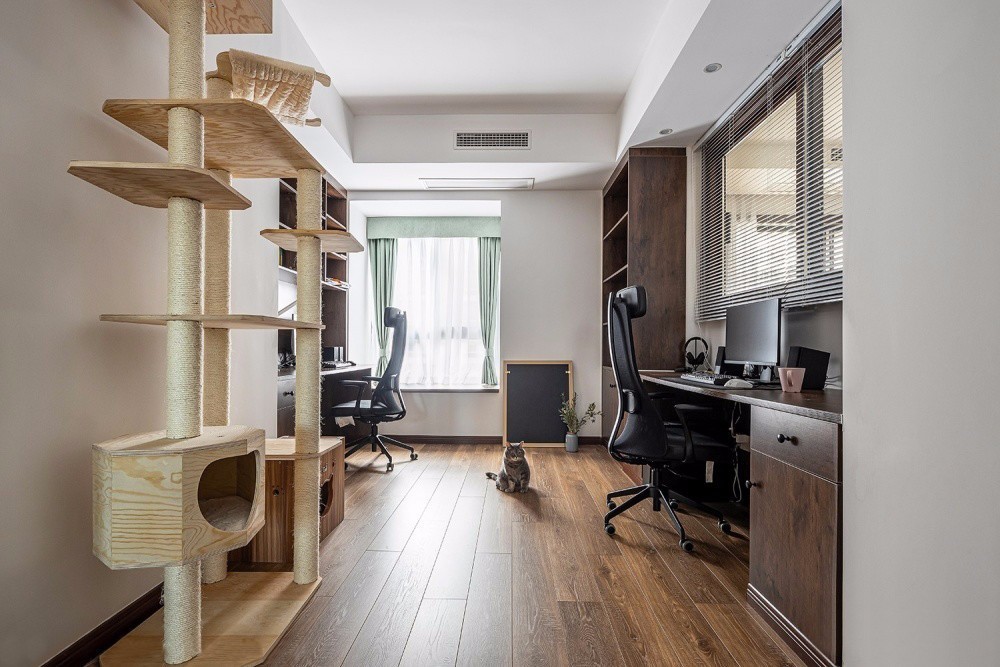 書房,貓爬架滿足了貓咪的娛樂,兩個書桌的設計,為愛打游戲更愛工作的屋主提供一個自由而愜意的空間。書房與客廳打通之后,采光通風都增強了不少。百葉窗簾具有良好的透氣性和隱私性,還可以提升空間的顏值與氣質。