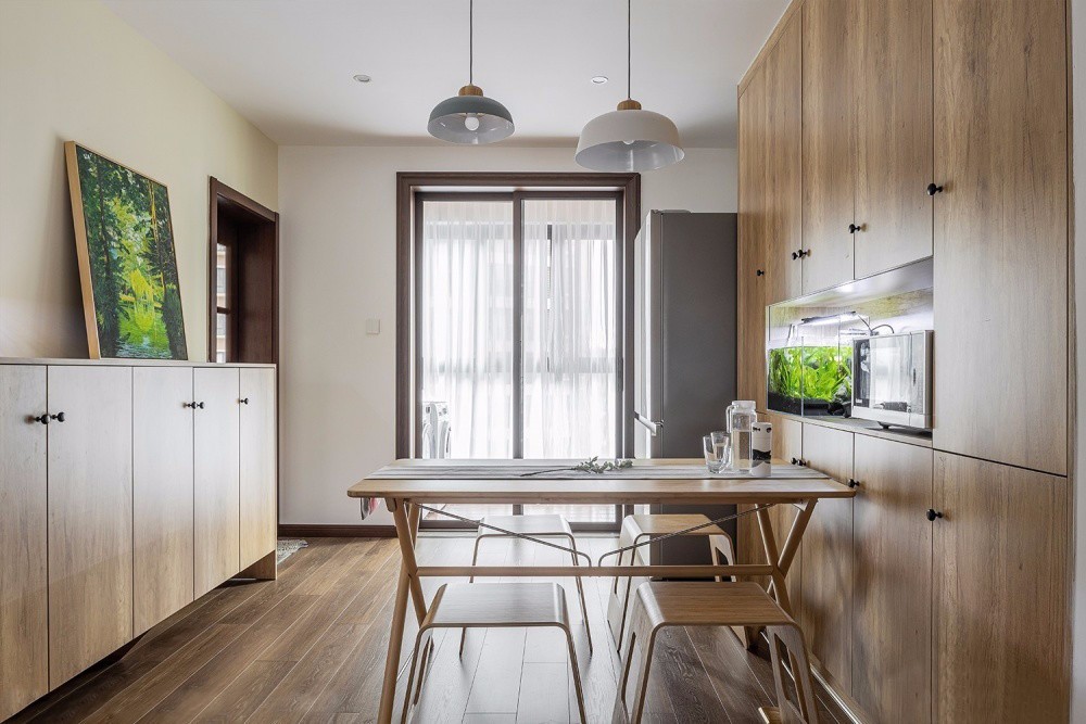 原木餐桌搭配簡單實用的紙片凳,簡約樸質而又利落。餐邊柜中空的設計,方便以后添置使用各種家電,提升幸福感與實用度。廚房墻面鋪設淺灰色六角磚,點綴藍色黃色與綠色,為空間增添了跳躍靈動感。與木質櫥柜完美結合,簡約自然中透露著精致感。
