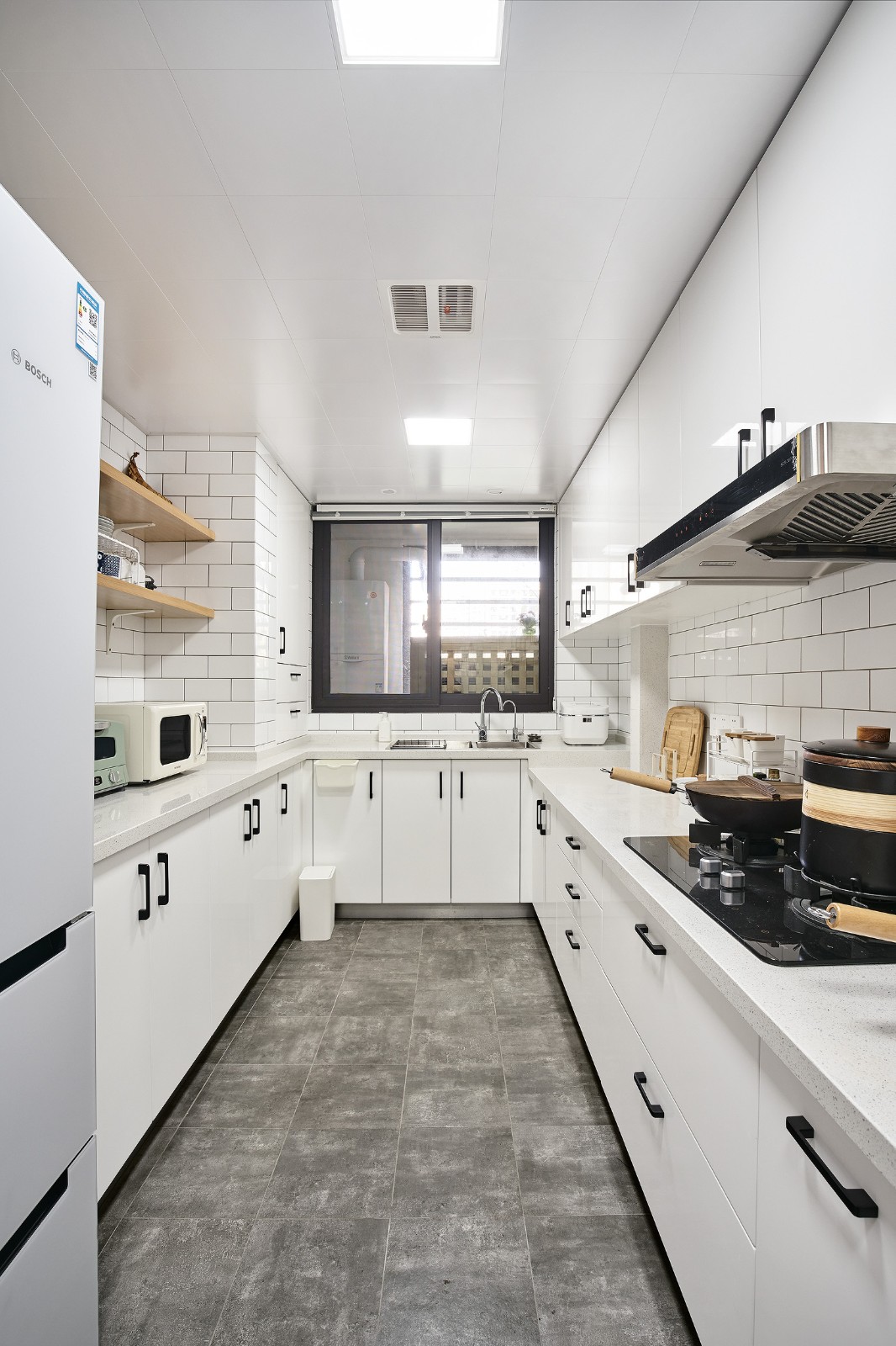 白色的廚房,視覺上大氣整潔。大理石地磚取代地板,打理起來更加輕松。