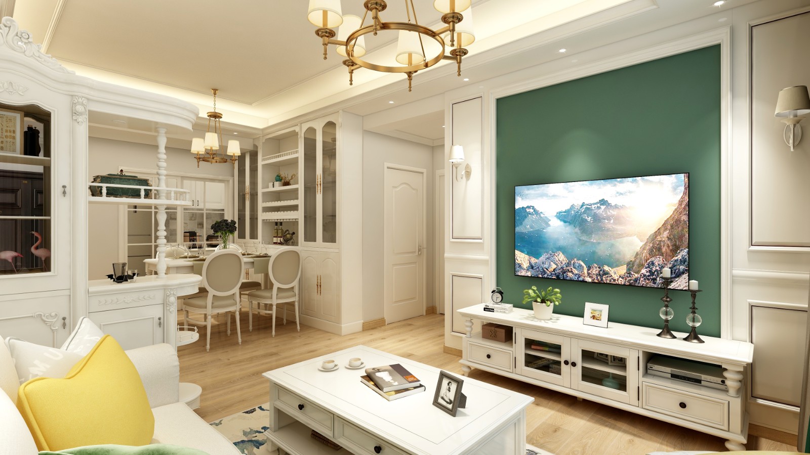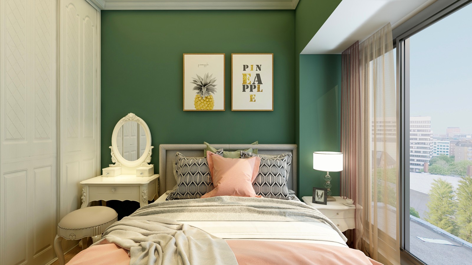 主臥背景墻延續電視背景墻的墨綠色調,寧靜、閑適、內斂,將兩幅黃色系裝飾畫引入空間,增添一絲活躍氣息。