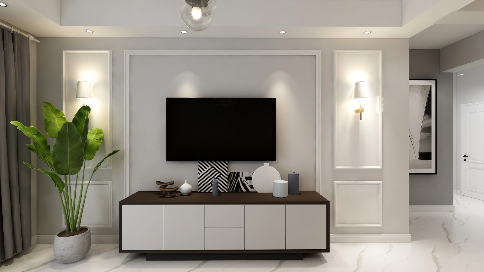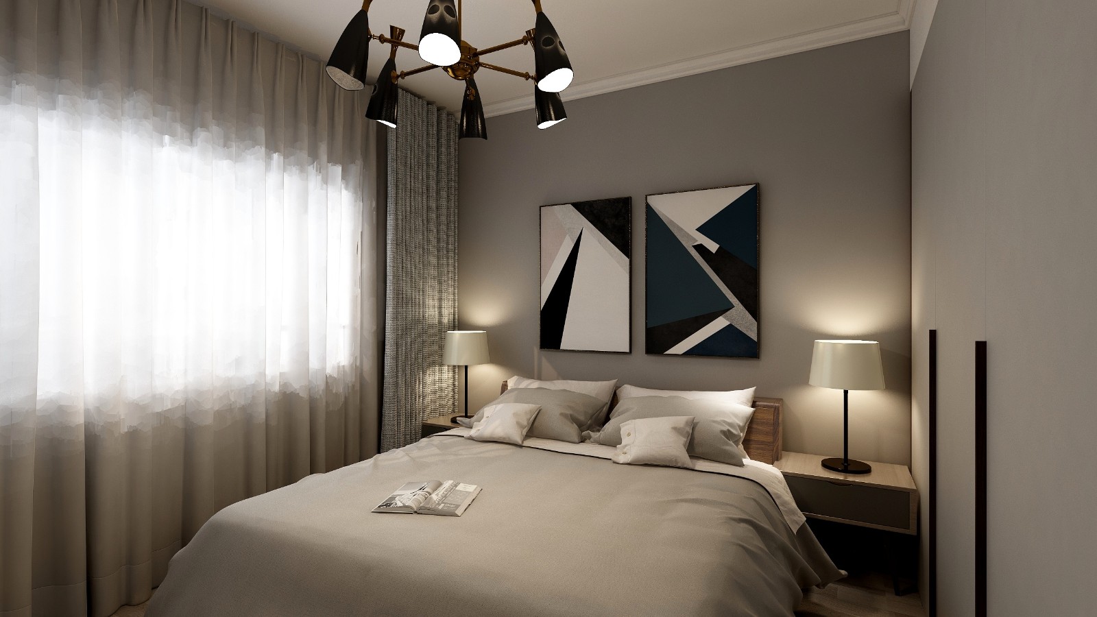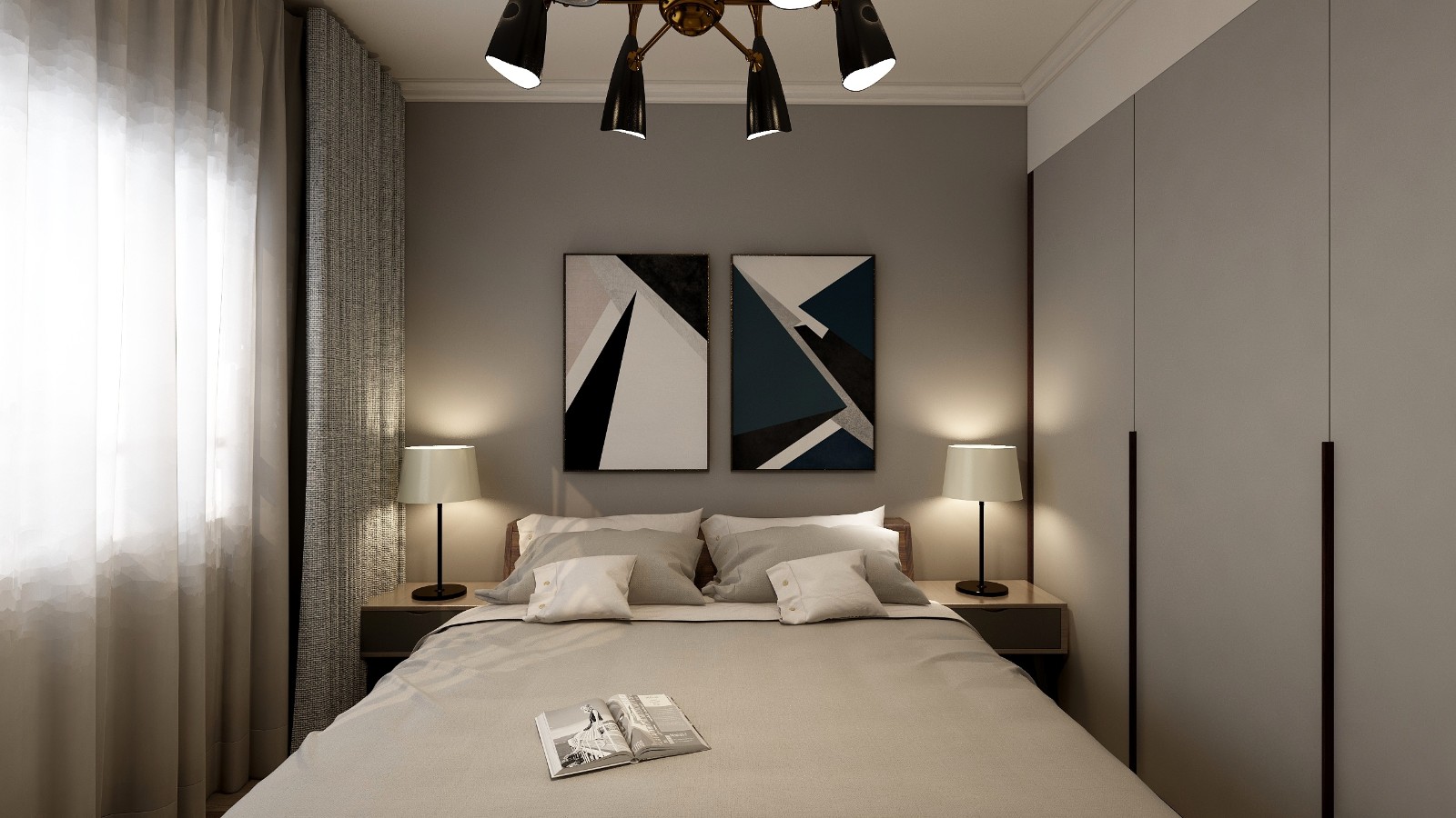 淺灰色的背景墻面漆,時尚動感的簡約風掛畫,十分具有現代風。一絲工業元素的棕灰色沙發搭配黑色的茶幾,深灰色加入一抹亮色黃,使空間的流行元素渲染出來。
